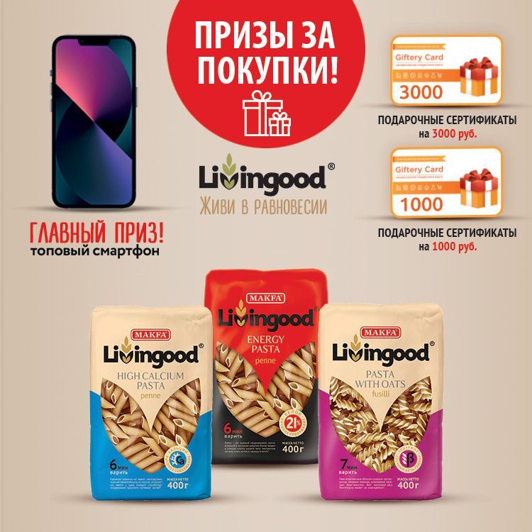 Покупайте продукцию LIVINGOOD в любом магазине «Окей», регистрируйте чеки в чат-боте и принимайте участие в розыгрыше крутых призов от MAKFA.