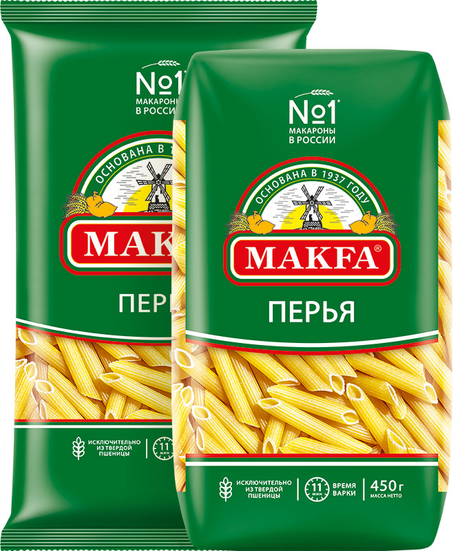 У этой формы макаронных изделий — потрясающая популярность. Соперничают по известности с ней только спагетти. Благодаря своей форме «Перья» особенно хороши с густыми соусами в духе итальянской классики, в легких салатах, нежных творожных и овощных запеканках.