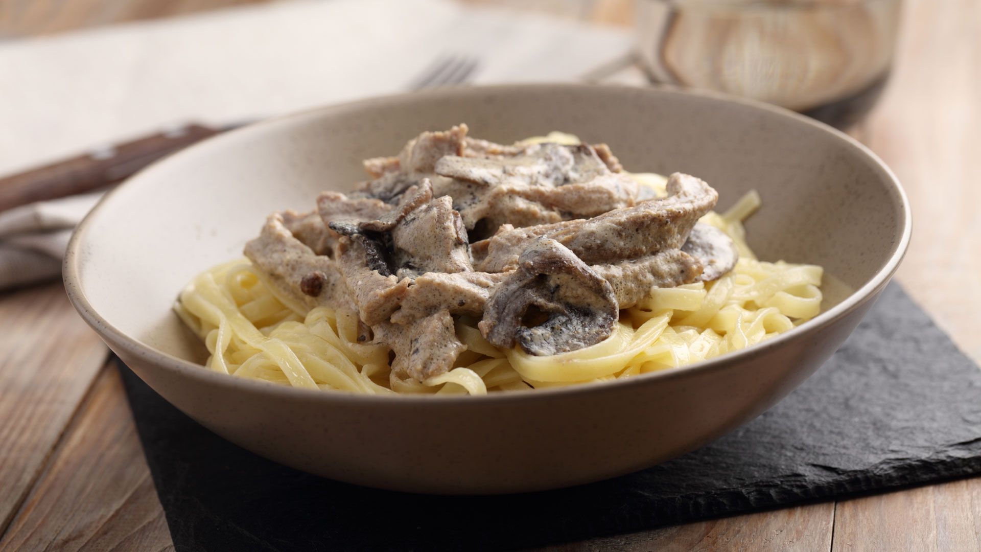 Гарнир для бефстроганова может быть разным: картофель, рис или макароны. Например, тальятелле MAKFA в гнездах – отличный выбор. Во-первых, с ними легко рассчитать порции: на одну персону нужно два гнезда. Во-вторых, эти макароны из твердой пшеницы не развариваются и идеально перемешиваются с ароматным соусом бефстроганова.