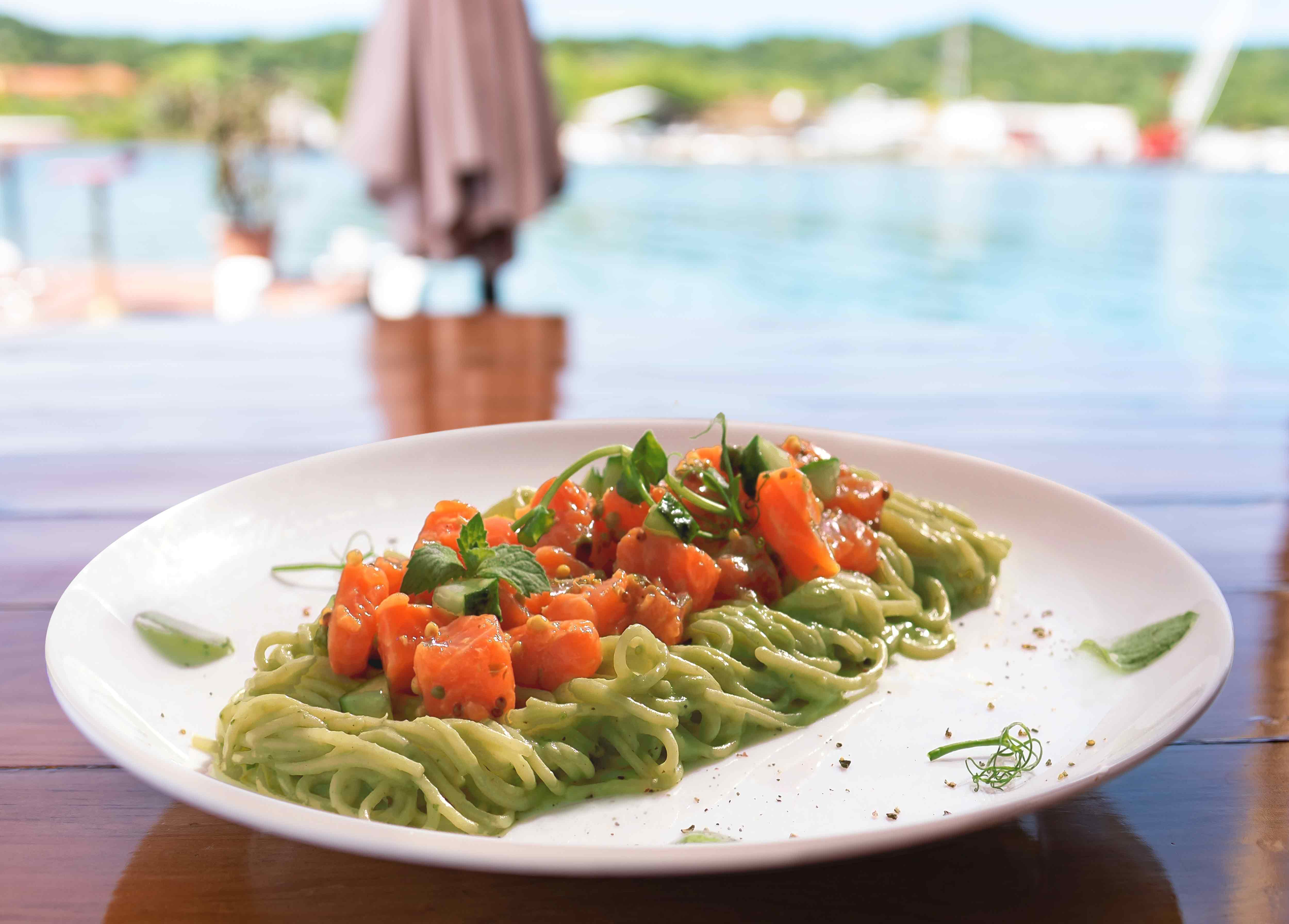 - 4 Подавать пасту с тартаром из слабосоленого лосося, украсив свежей зеленью.