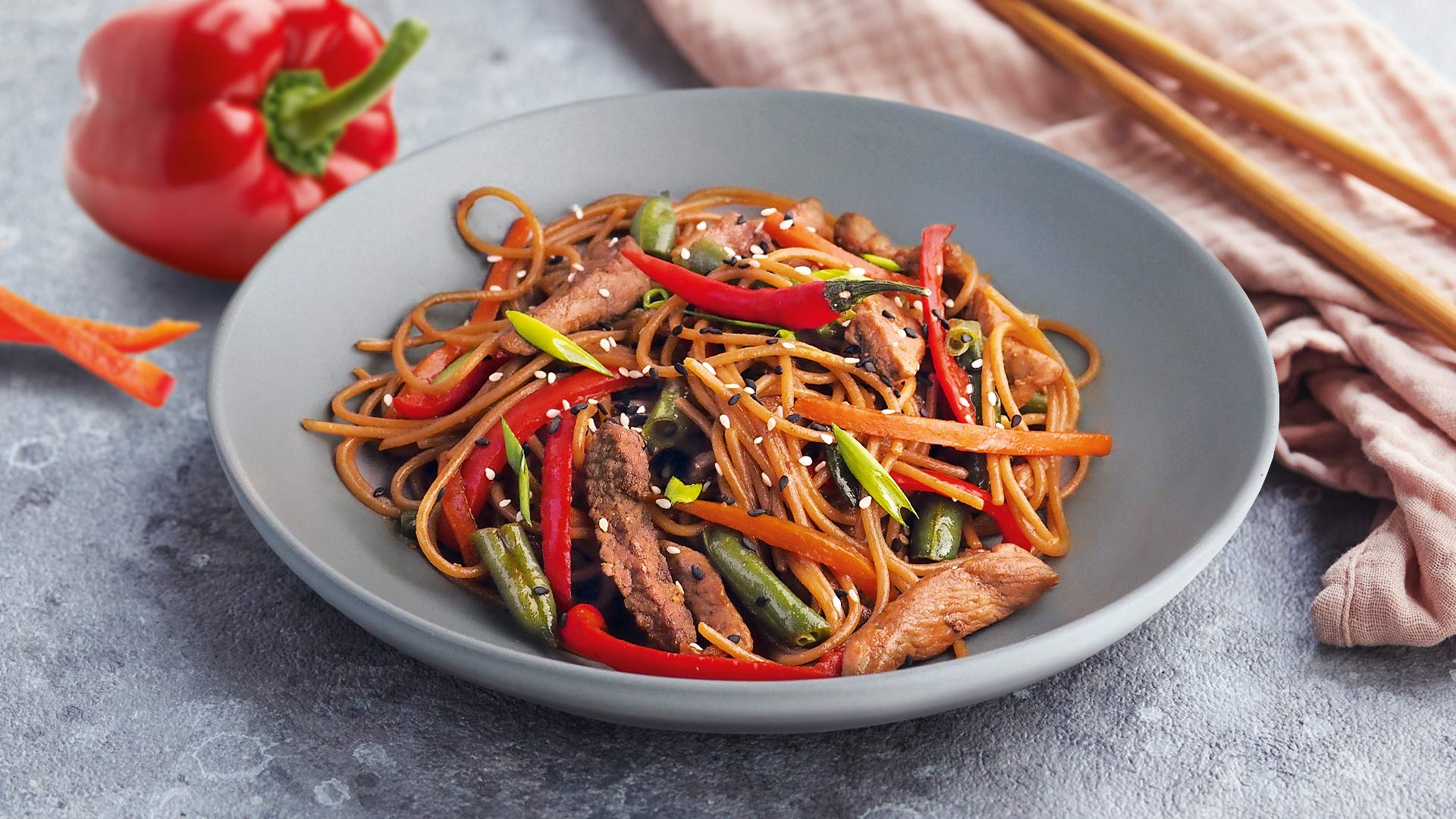 Если вы ищете сытное и несложное в приготовлении блюдо, этот рецепт для вас. Нежная говядина в пикантном соусе, аппетитные макаронные изделия и сочные хрустящие овощи готовятся всего за 20 минут.