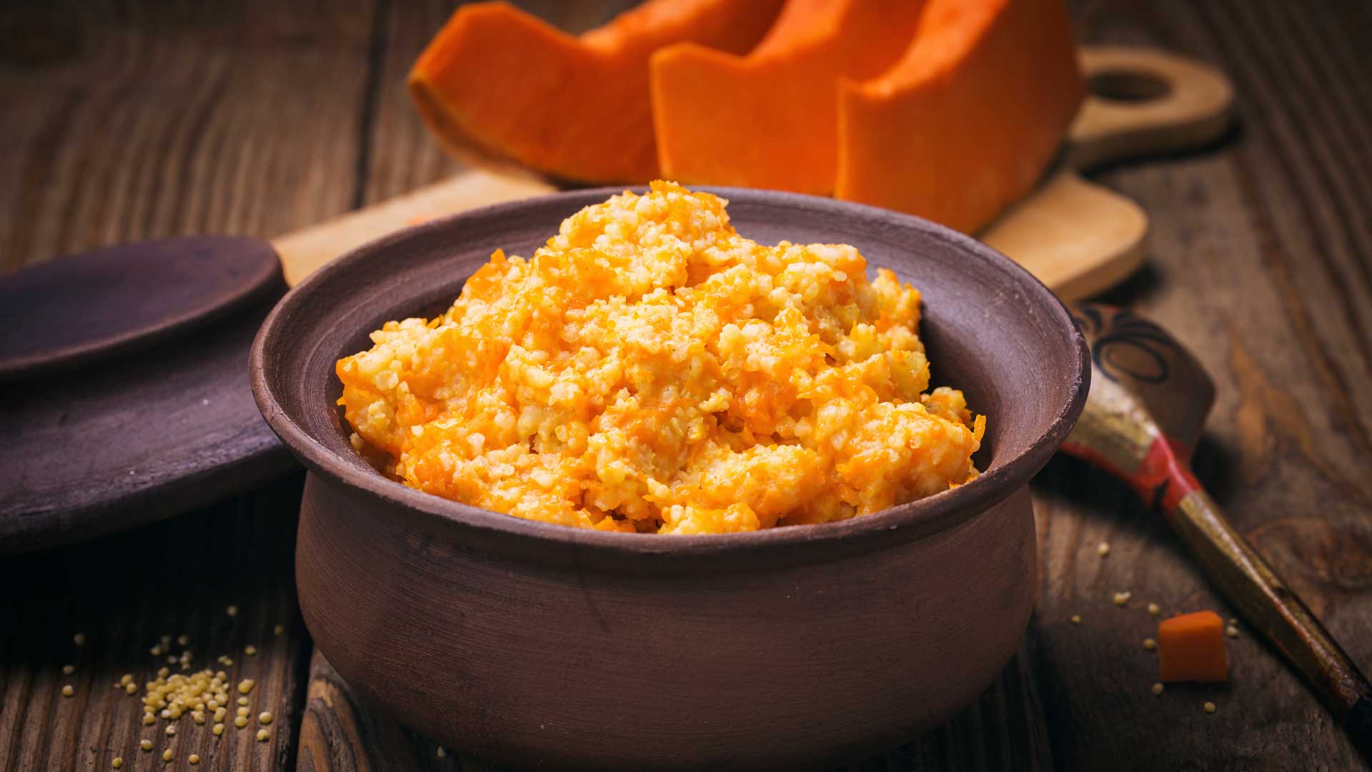 - 4 В готовую горячую пшенную кашу добавьте 60 г сливочного масла и пюре из тыквы. Хорошо перемешайте, посолите, подсластите по вкусу.