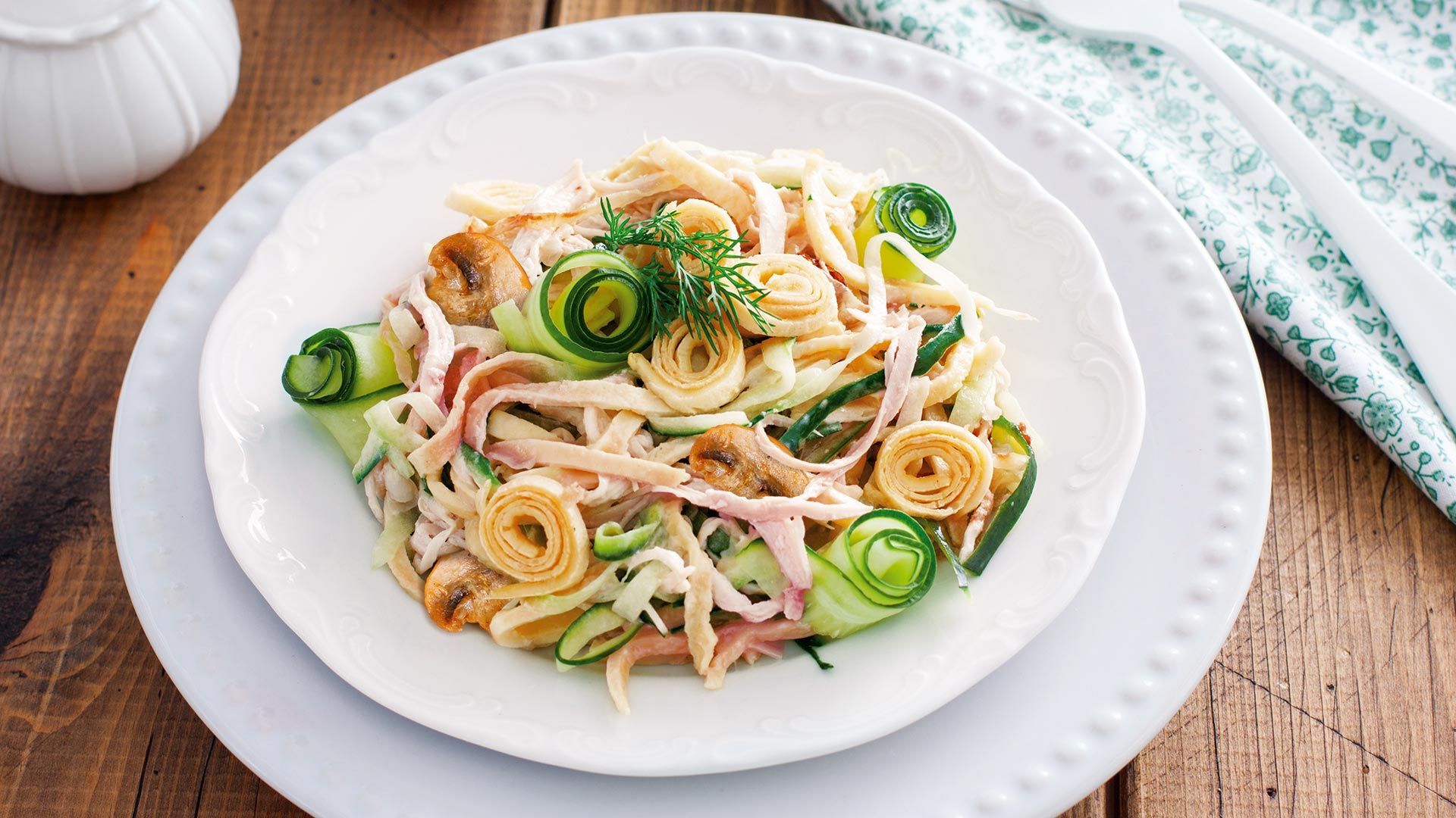 Этот необычный рецепт блинного салата удивит своим гармоничным и сбалансированным вкусом. Пикантная заправка из йогурта, сочная ветчина, нежные блинчики, ароматные грибы и свежесть огурца — все компоненты идеально сочетаются между собой.